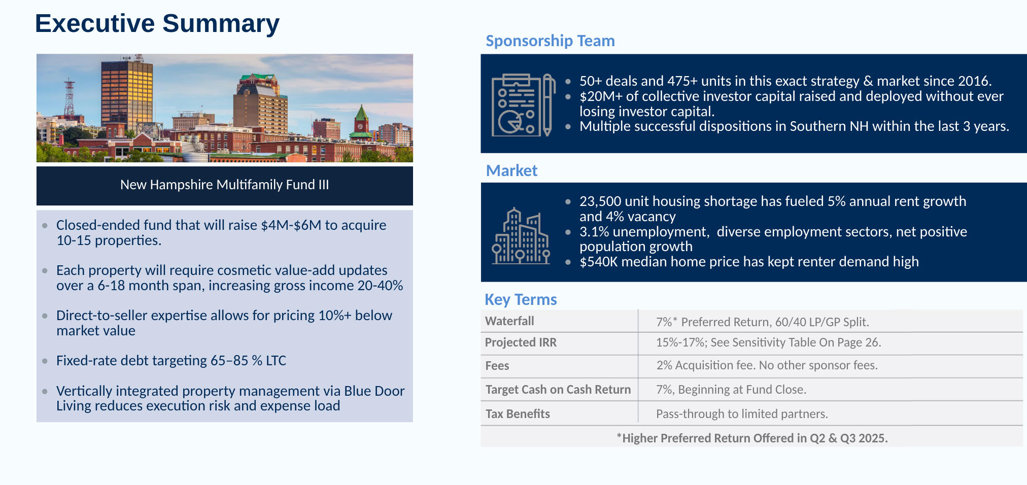 We've found the best opportunity in buying small, inefficiently priced assets in a market where we've built a significant track record.The problem is that it's historically been difficult for passive investors to participate in small deals. The solution is to group small assets into a larger fund, which gives investors diversification across 10-15 properties.This fund will acquire sub-50-unit B/C-class multifamily assets throughout New Hampshire, predominantly through a direct-to-seller approach that we've cultivated over the last decade. We are primarily focused on assets where our team, which has been the principal party in 50+ transactions in using this exact strategy, with the vast majority happening in the last three years.Our vertically integrated platform allows us to source deals directly from owners, then operate the asset with our own team in NH. Our vertically integrated platform aligns interests with our investors & significantly reduces execution risk associated with buying and holding multifamily properties versus using 3rd-party, unaligned site staff/PMs.